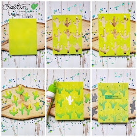 I then started with the background, to color the background I used Mermaid Lagoon Oxide Ink with some water splashes. I cut a strip of black cardstock for the road and with a wave die I cut from kraft cardstock the sand, I wanted this party to be at the beach.